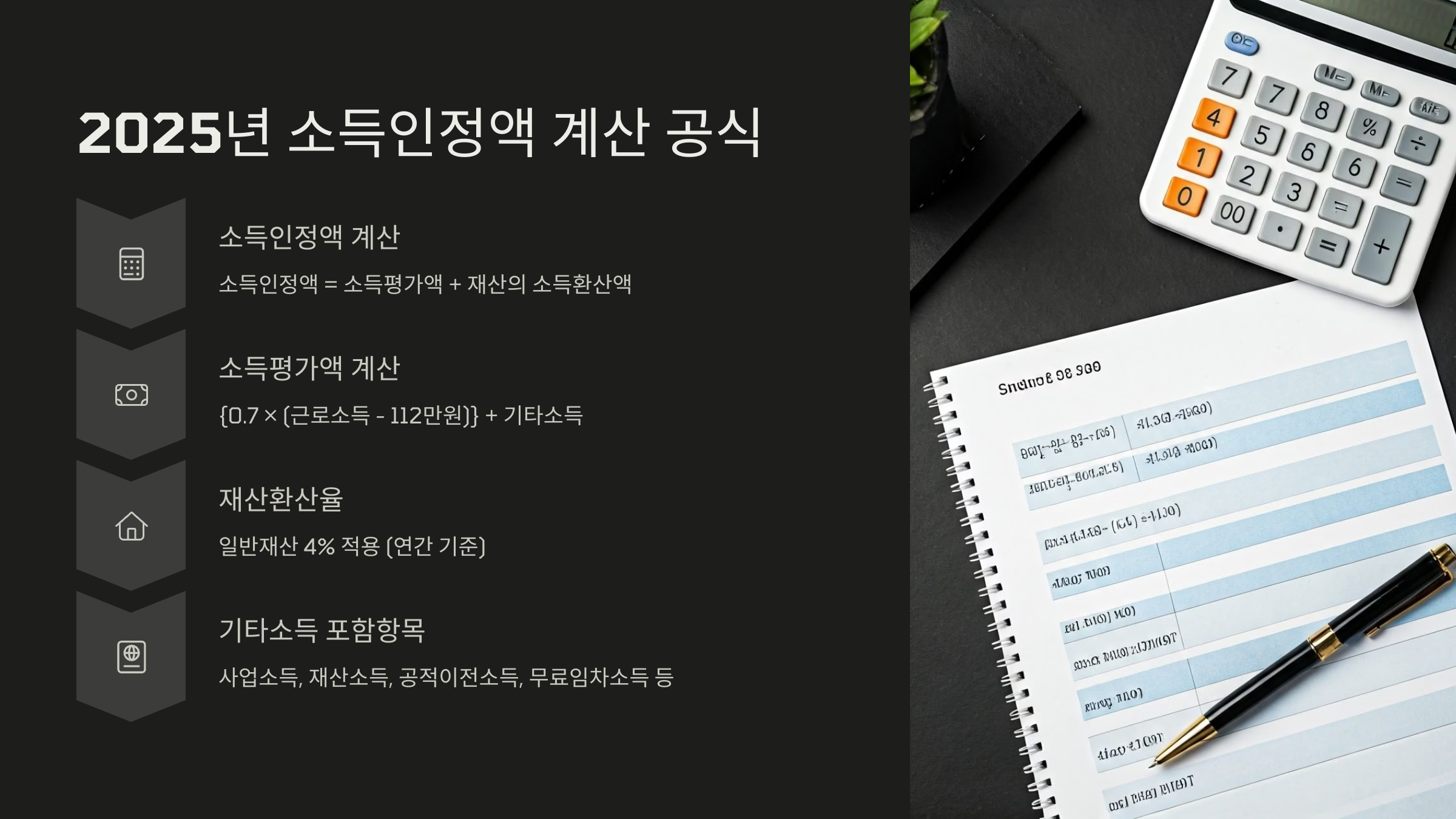 소득인정액은 아래 공식에 따라 계산돼요. 여기서 '재산의 소득환산액'이 가장 많은 분들이 놓치는 부분이에요.